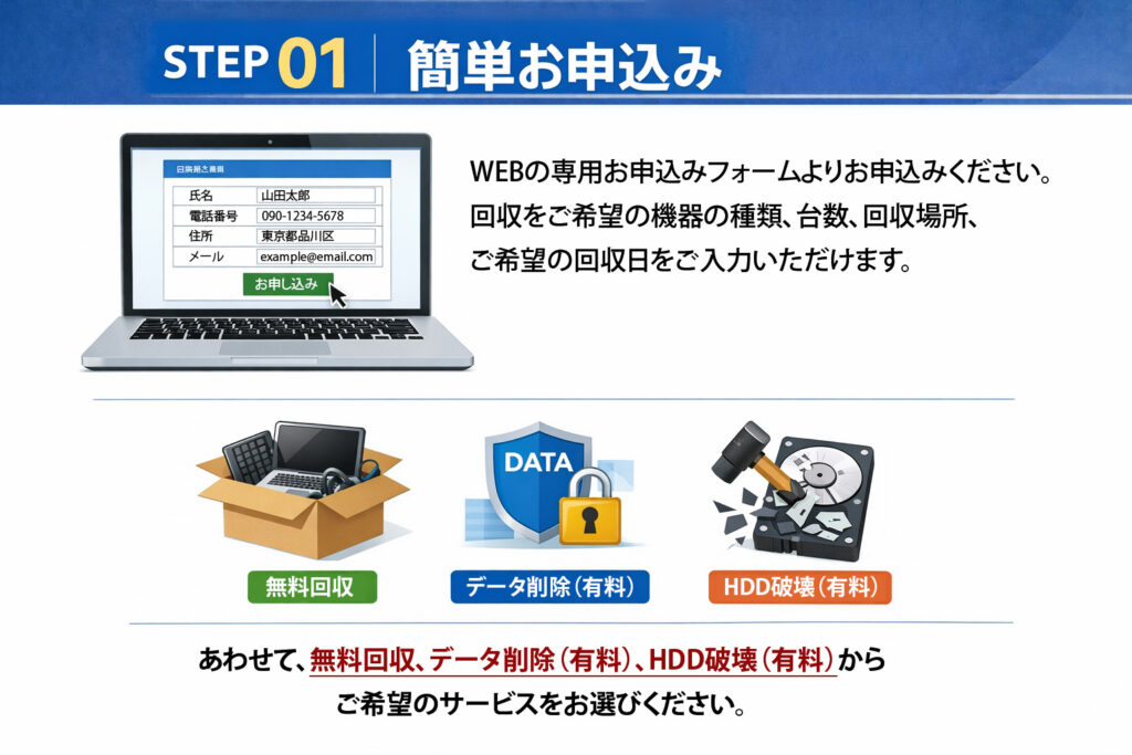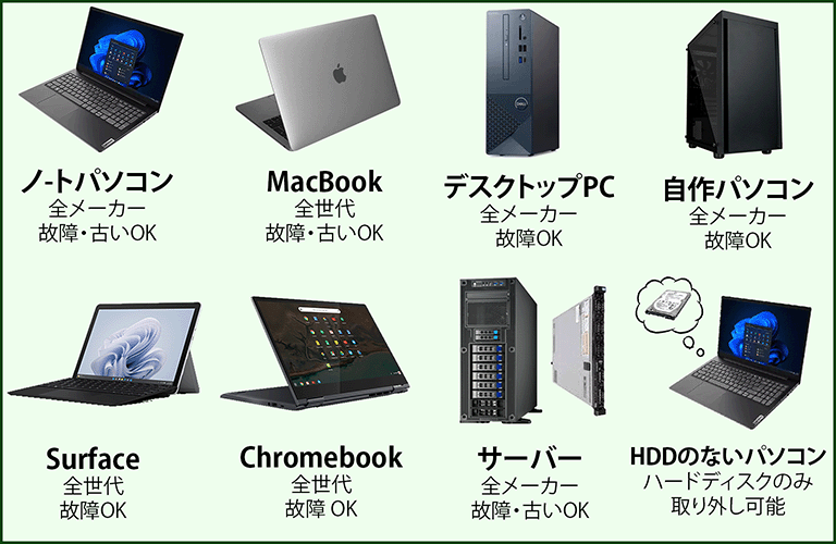 | Q – 「4台以上」とは、どの機器が対象ですか? A – 以下の機器が対象となります。 ・ノートパソコン (MacBook/Surface/Chromebook 含む、HDDなしでもOK) ・デスクトップパソコン (デスクトップPC/自作パソコン 含む、HDDなしでもOK) ・サーバー (HDDなしでもOK) ※上記の機器を合計4台以上回収する場合、関東エリアは出張費無料となります。 |