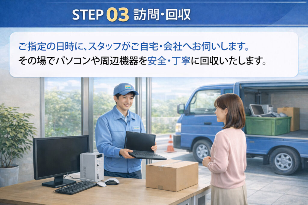 | Q – いつ回収に来てもらえますか? A – お客様のご希望日時をもとに調整いたします。 回収日時・回収場所を事前に確認のうえ、スタッフがご自宅・会社へお伺いします。 |